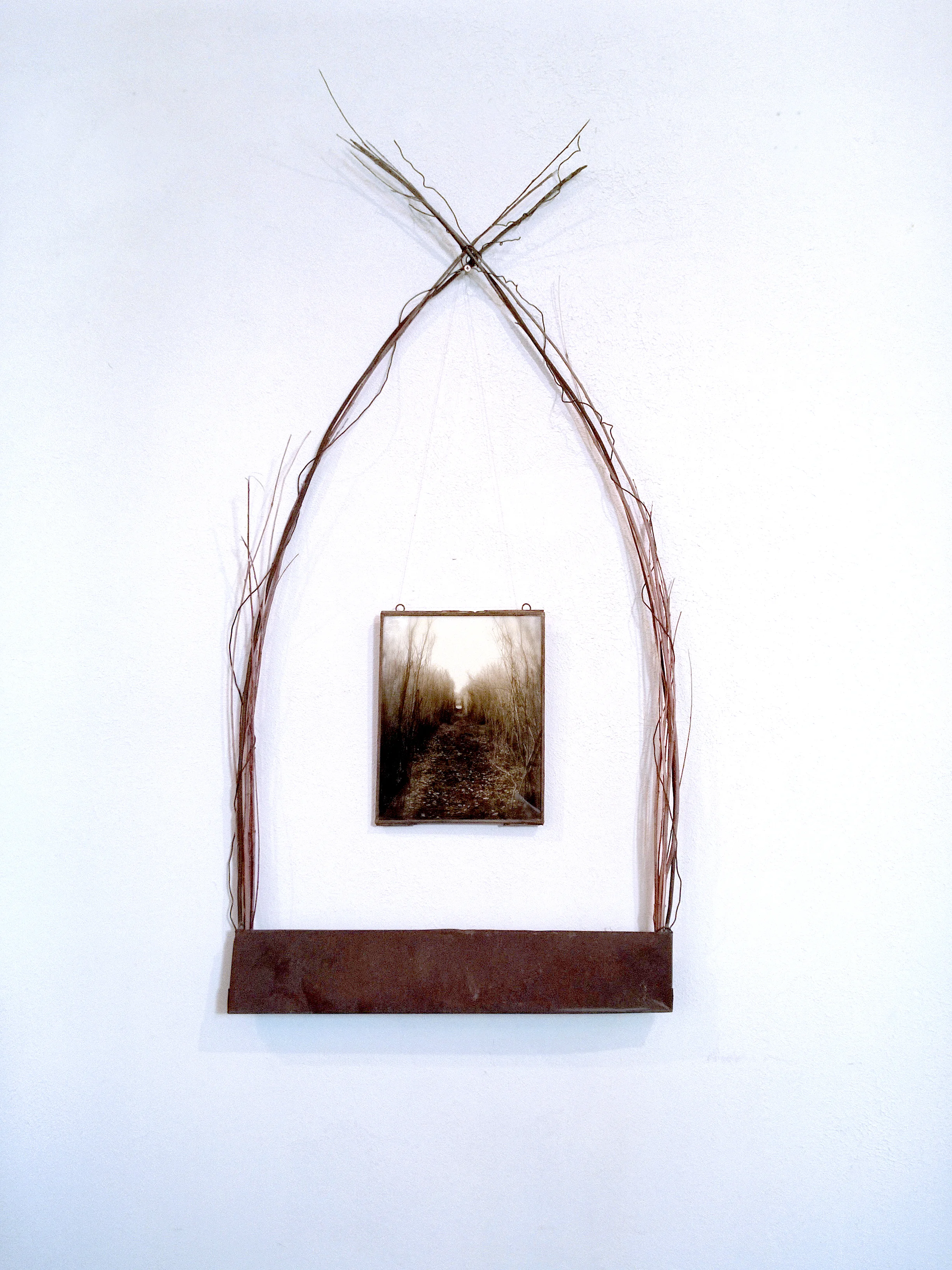 Assemblage with digital print on fine art paper, zinc frame, coyote willow, metal panel, bosque wire