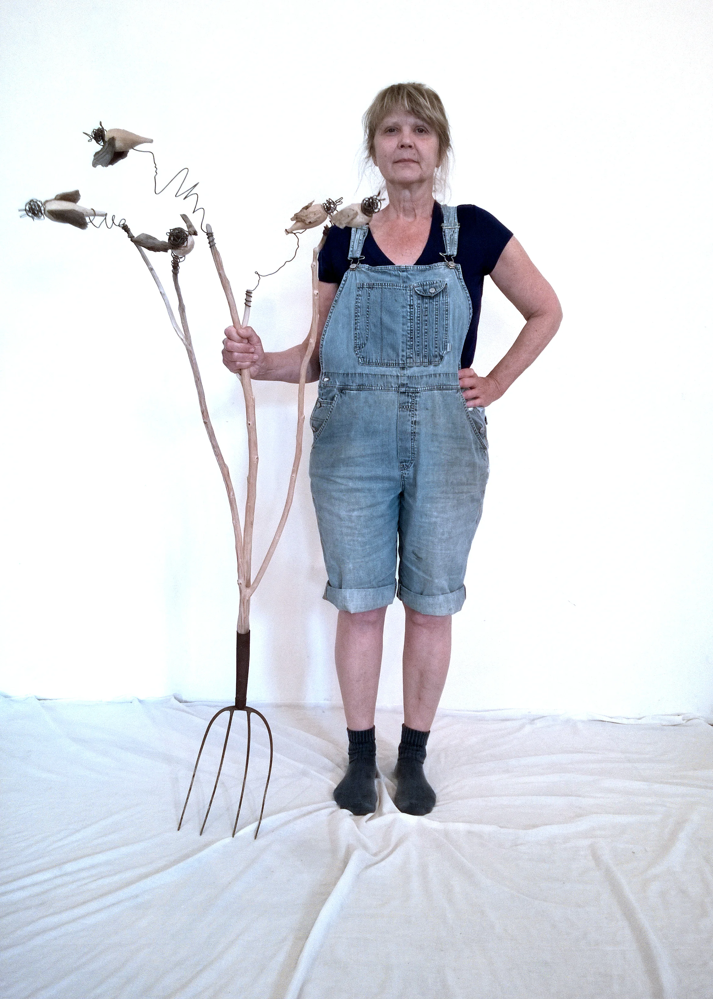 Assemblage with pitchfork, mimosa branch, carved bass wood, bent wire, found wood